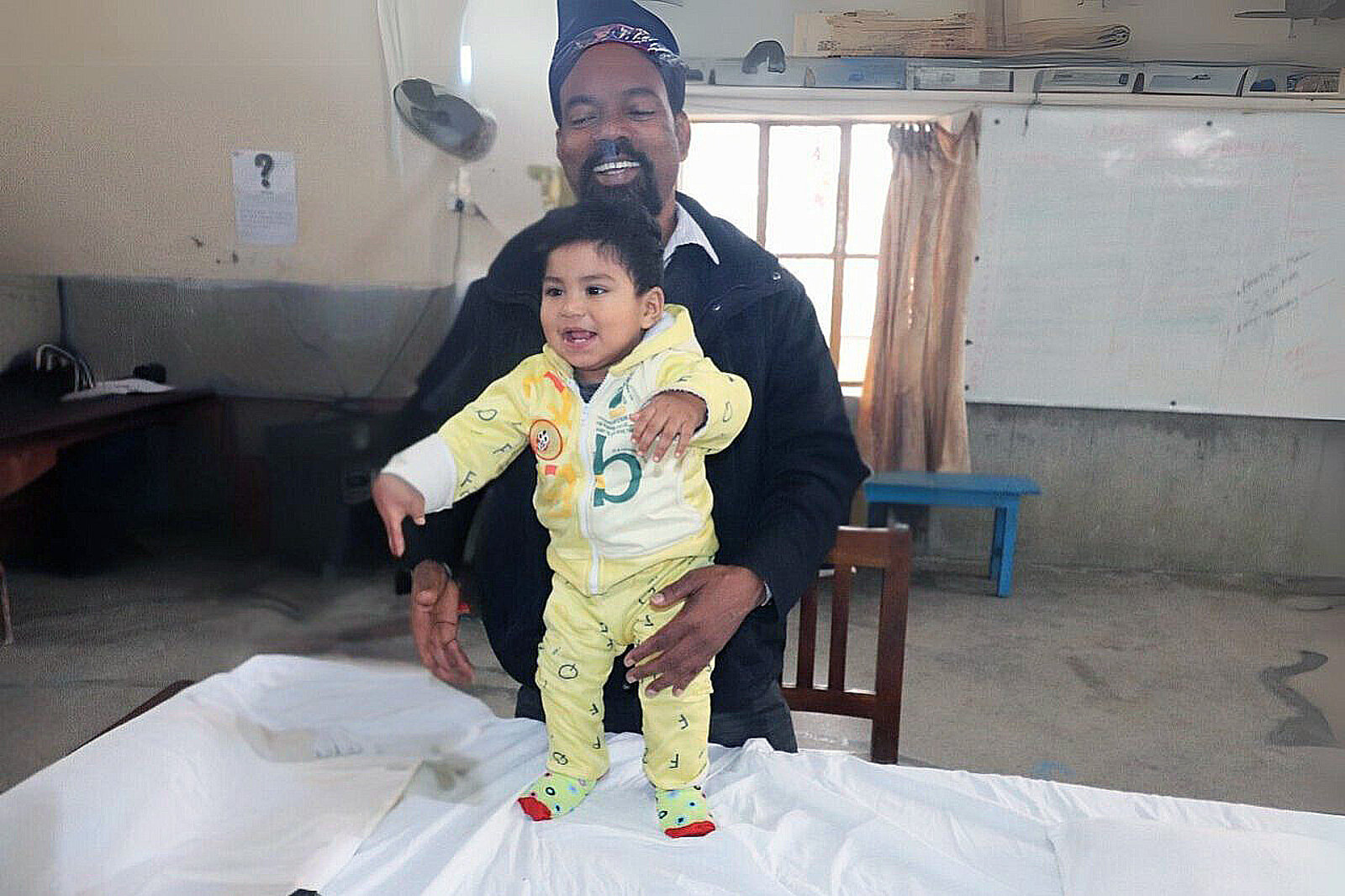 Da drengen var 15 måneder gammel, blev han indlagt på DBLM-hospital, som diagnosticerede ham med spastisk lammelse. Fysioterapeuterne begyndte behandling med funktionelle øvelser for at forbedre hans motorik. Efter nogle måneder kunne drengen begynde at sidde op, kravle og forsøge at stå.